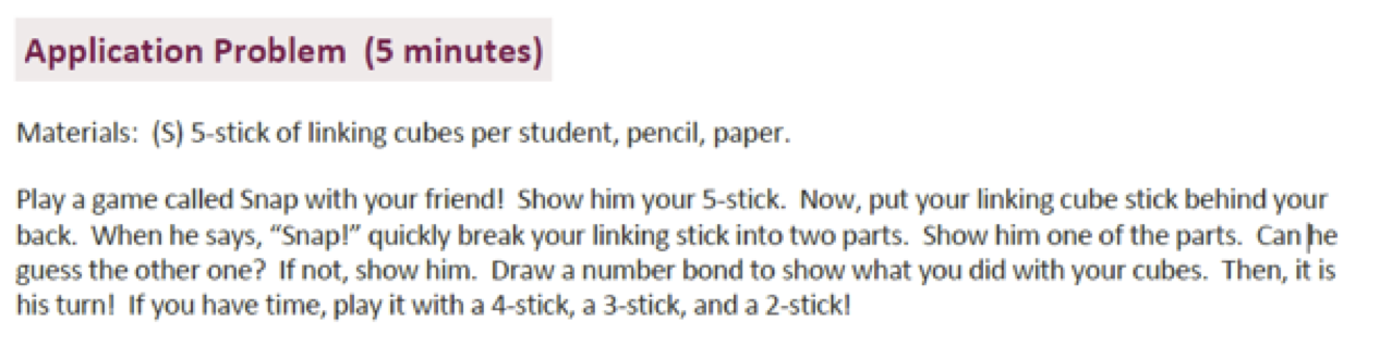 One of the fluency games that the passionate group of educators suggests is called Snap It, where students take a linker cube train with a specified number of cubes. On the signal, they break the train into two parts, hide one part behind their back and then the other children have to work out what the missing part is. We whole-heartedly agree with this activity and include something very much like it in the curriculum. The following application problem comes from Module 4 of Kindergarten: